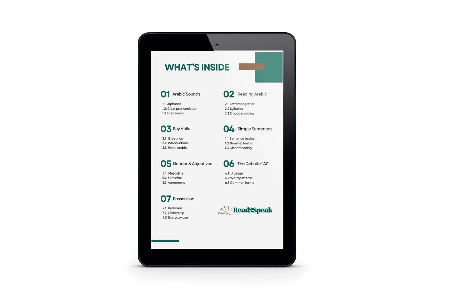 Arabic Foundations (A1–A2) is a complete self-study eBook for absolute beginners who want to start from zero and build a solid foundation in Modern Standard Arabic (MSA), the standard form of Arabic used across the Arabic-speaking world.
