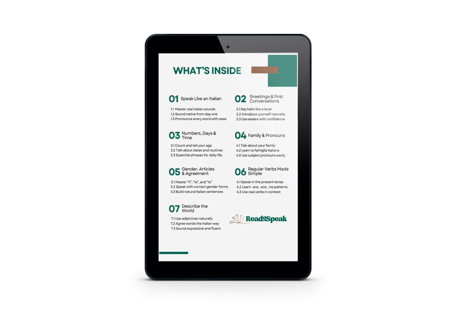 Italian Foundations (A1–A2) is a complete self-study eBook designed for absolute beginners who want to learn Italian from scratch and reach A2 level according to the CEFR.